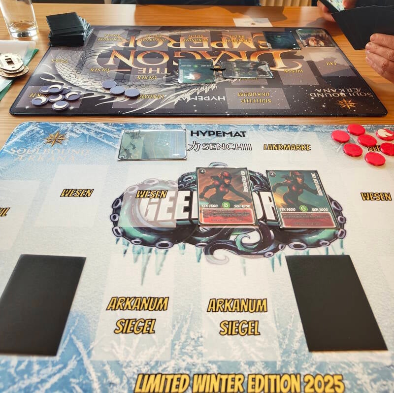 | Ressourcen-System | Seelenpunkte zahlen für Bindungen, das Wirken von Arkanum und das Versiegeln des Gegners | Mana-Farben und Länder | Keins, alles über Tribut/Stufe |